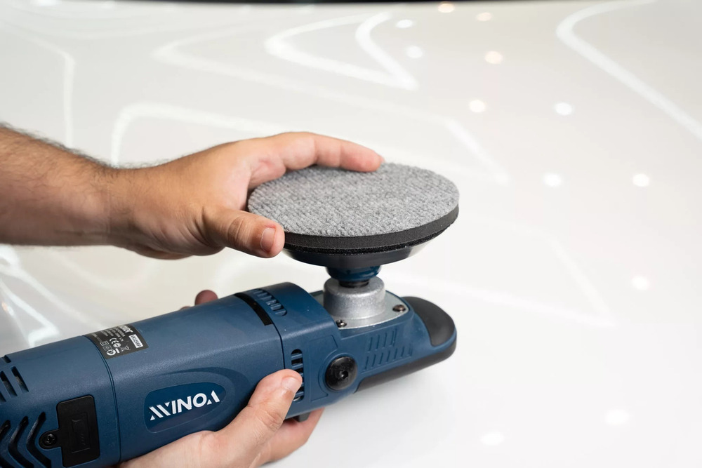 Se recomienda VONIXX CARPET BEET para pulir vidrio. El disco tiene alto rendimiento en la fase de corte y elimina eficientemente las marcas proporcionadas por la lija de grano P600 y tiene capacidad para eliminar rayones leves, moderados y marcas de lluvia ácida.