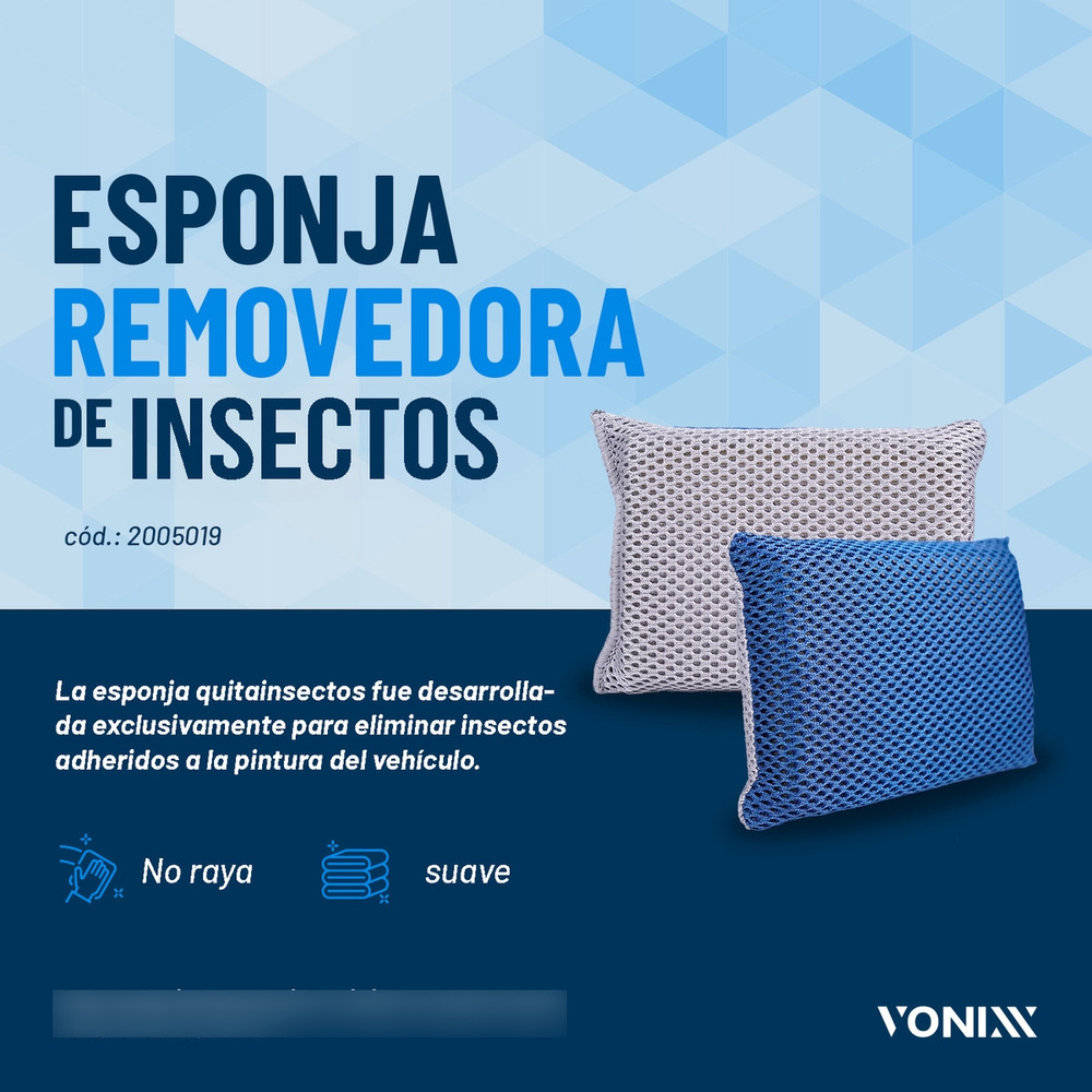 La Esponja Quita Insectos fue desarrollada exclusivamente para eliminar insectos adheridos a la pintura del vehículo. El producto ayuda a eliminar la suciedad más severa, como el alquitrán y las colas adhesivas, sin dañar la pintura del vehículo.