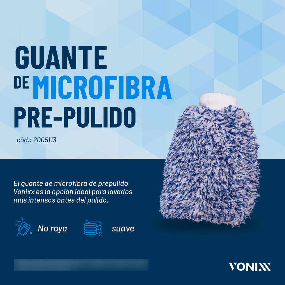 El guante de microfibra para prepulido Vonixx es la opción ideal para lavados más intensos antes del pulido. Su composición proporciona un lavado más profundo sin dañar la pintura del vehículo y sin rayones.