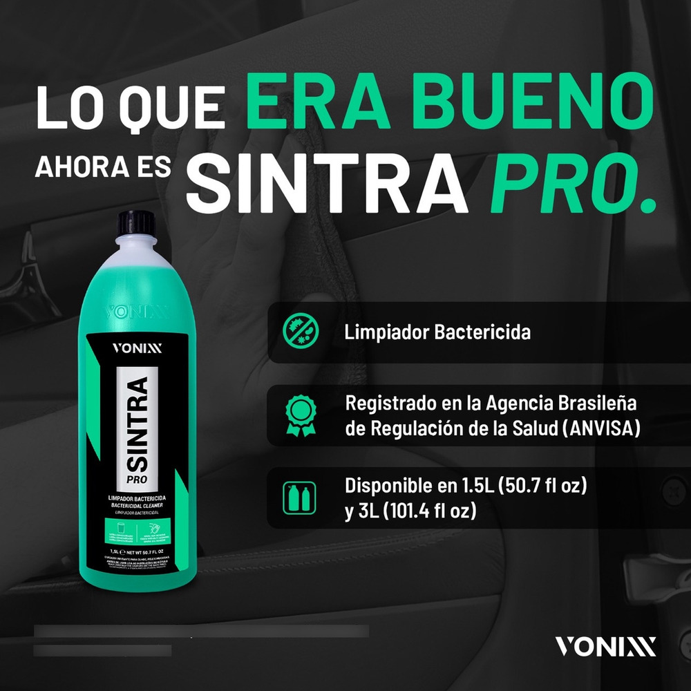 SINTRA PRO – LIMPIEZA INTERNA es un multilimpiador de flotación bactericida ultraconcentrado y con pH equilibrado, indicado para la limpieza de paneles, costados y esquinas de puertas, encimeras de cuero, alfombras y tapizados. Promueve un alto poder para eliminar manchas de grasa y suciedad diversa, además de eliminar microorganismos causantes de enfermedades en el interior del vehículo. La baja formación de espuma lo hace ideal para su uso en extractores, eliminando la suciedad del interior del vehículo y dejándolo nuevamente limpio. SINTRA PRO reduce los malos olores en el interior del vehículo, volviéndolo más saludable y libre de impurezas.