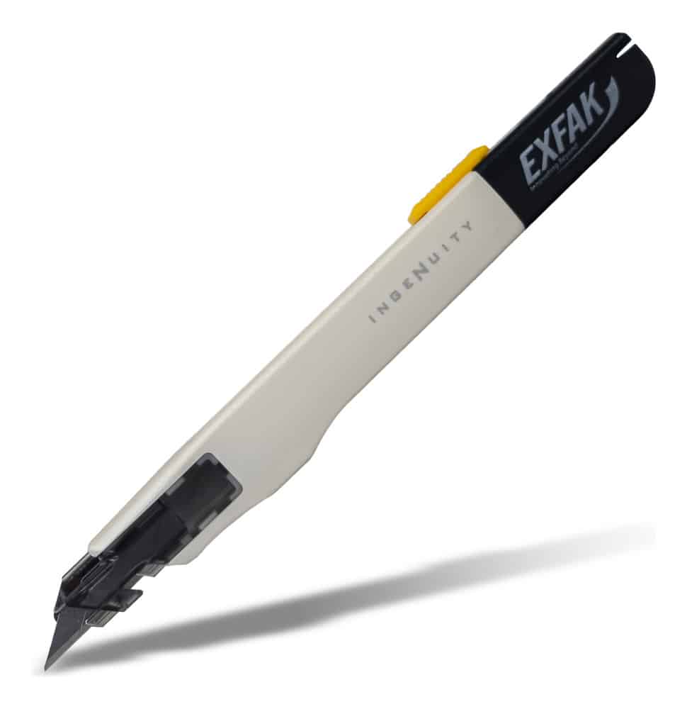 Cutter profesional EXFAK EX PRECISION. Para filos de 9mm. La abrazadera transparente estabiliza a lamina durante el corte. Lamina de 30º, mejor para trabajos de precisión. Cuerpo de perfil triangular para diestros, zurdos y agarre firme. El dispositivo de bloqueo automático soporta hasta 5kg de presión.